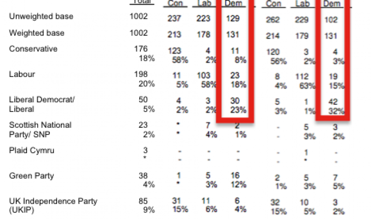 Secondly, and potentially much more significantly, is the question of why the unweighted sample was so unrepresentative. If a lot of people were indeed out shopping, it follows that there is a significant risk those that were home to answer their landlines could have been unusually unrepresentative of the 2010 Lib Dem cell as a whole. The split (by current voting intention, with DK/refusals left in) of 3% Tory 18% Labour and 32% Lib Dem is starkly different from November’s 8%/15%/23%, which was also very much in line with what other pollsters have been showing. Once you adjust for the “Don’t knows”, this explains the bulk of the swing.